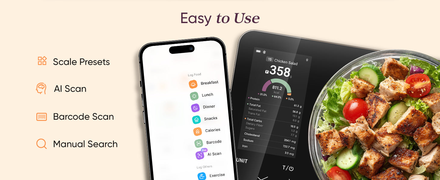 - ๐ต๐๐๐๐๐๐๐๐๐๐ ๐ซ๐๐๐ ๐๐ ๐๐๐๐ ๐ญ๐๐๐๐๐๐๐๐๐: Receive nutrition information easily by choosing from 50 presets on the scale, scanning barcodes in the app, using AI to scan food, or searching by name
