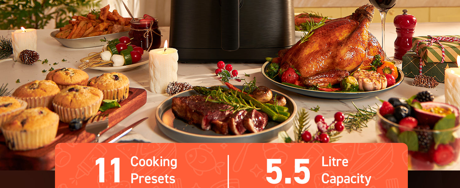 - 【Spacious 5.5L XL Capacity】Our air fryer designed for family boasts a generous size offers 15% more cooking space, compared with dual basket airfryer, enjoying a more evenly cooking finish