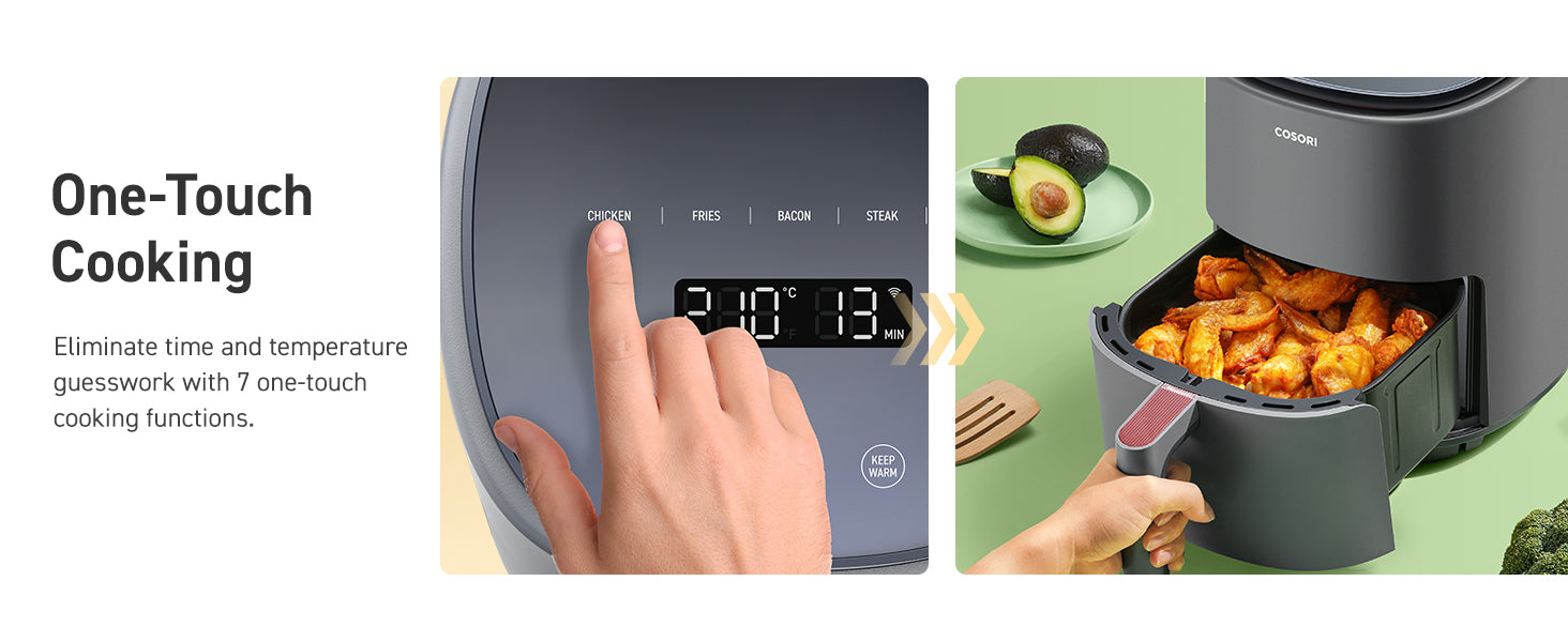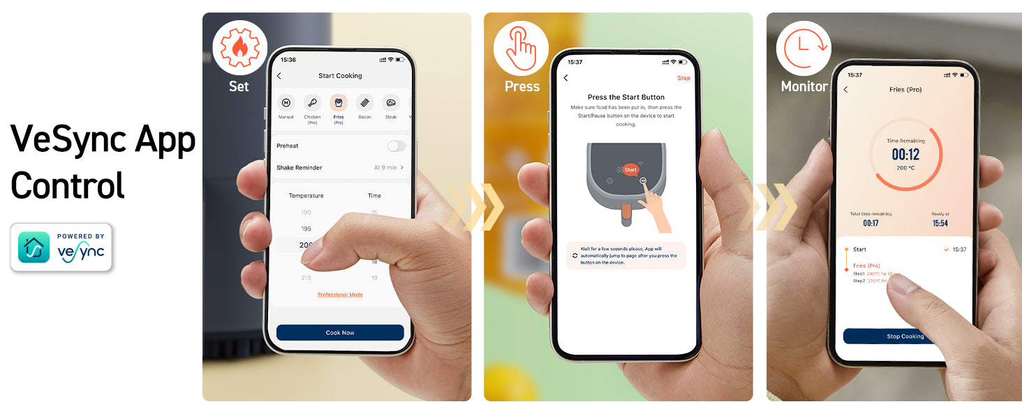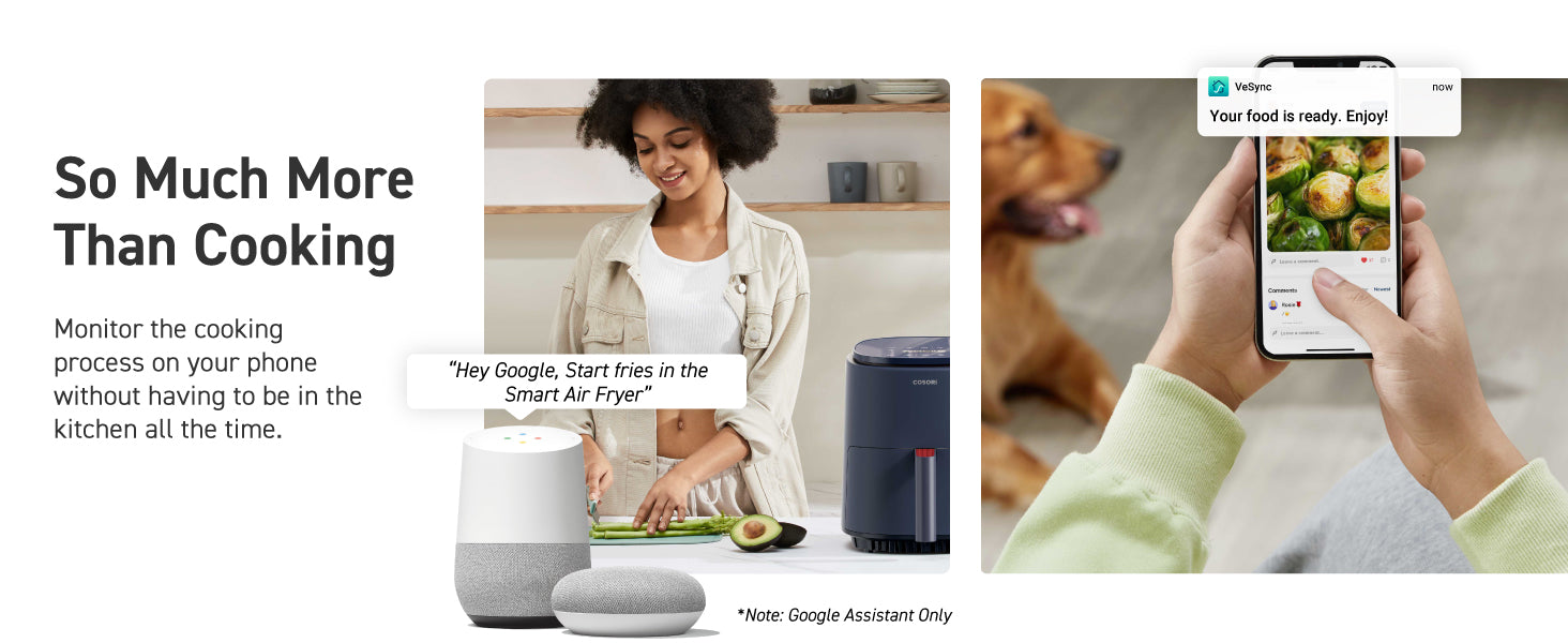 - ๐๐๐ฌ๐ฒ ๐ญ๐จ ๐๐ฌ๐: Chicken, Fries, Bacon, Steak, and Veggies. Enjoying one-touch food presets for simple cooking and cook with your smartphone using the free VeSync app and connect to Google Assistant for hands-free cooking